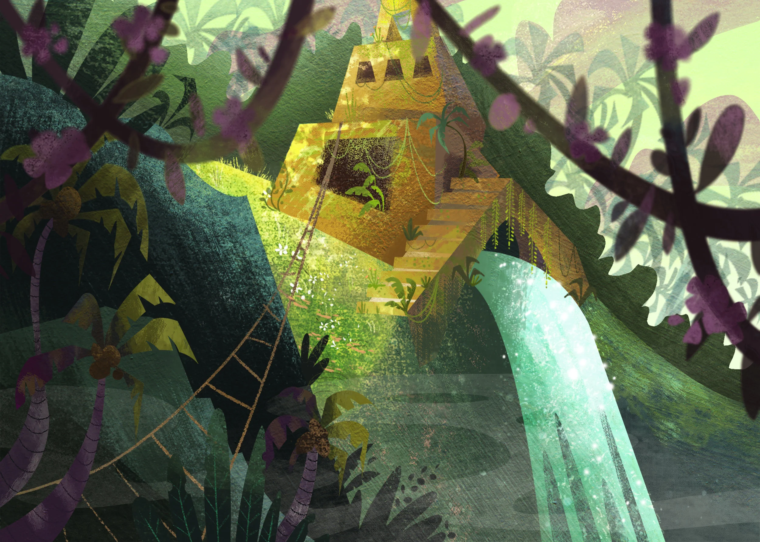 The goal for this project was to create a tropical Mayan habitat through structure, environment, and atmosphere. .Located in the dense Mexican jungle, the ancient Mayan temple would remain hidden for centuries..Key words for this project were hot, humid, steamy, and lush. I wanted the established mood to be playful yet mysterious.